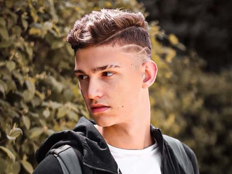 This fade has designs in the sides, as well as shorter hair around the side part, which helps to prevent it from looking messy and shaggy, instead of loose and chic.
